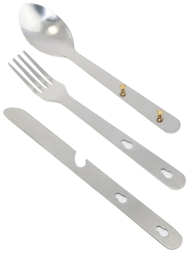 Σετ μαχαιροπίρουνα ιδανικό αξεσουάρ για να απολαύσετε το γεύμα σας στην ύπαιθρο! Το σετ περιλαμβάνει μαχαίρι, πιρούνι και κουτάλι τα οποία στοιβάζονται και καταλαμβάνουν ελάχιστο χώρο για εύκολη μεταφορά. Στο πιρούνι υπάρχει ειδική εγκοπή η οποία χρησιμοποιείται για ανοιχτήρι μπουκαλιών. Μεταλλικά και χωρίς αιχμηρά στοιχεία ή άκρα που θα μπορούσαν να βλάψουν το σακίδιο ή τον υπόλοιπο εξοπλισμό σας. Μια πρακτική και εύχρηστη λύση για την κατασκήνωση σε μια πραγματικά οικονομική τιμή, που θα σας λύσει τα χέρια και δεν πρέπει να λείπει από τον εξοπλισμό των διακοπών σας!