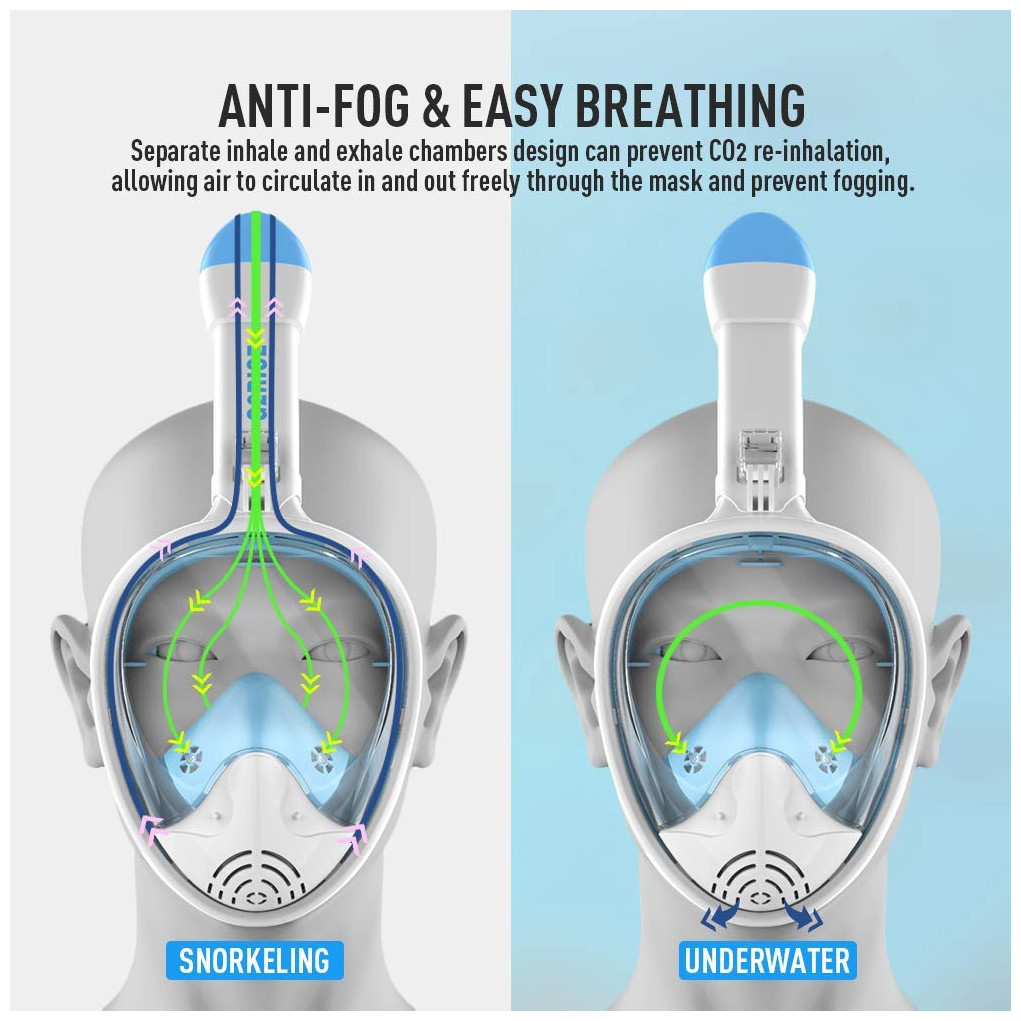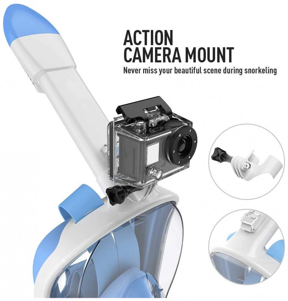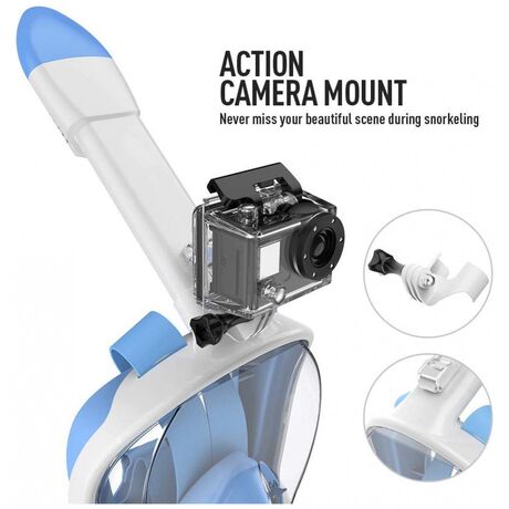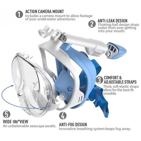 Μάσκα Κατάδυσης Full Face της εταιρείας Viking F-200 με εξαιρετική ποιότητα κατασκευής και χαρακτηριστικά που επιτρέπουν την σωστή εφαρμογή και λειτουργία της. Διαθέτει μεγάλο ενσωματωμένο αναπνευστήρα με σύστημα αποτροπής εισροής νερού κατά την κατάδυση, ανεπίστροφες αντιθαμβωτικές βαλβίδες που συνδυάζονται με ξεχωριστό κανάλι για την εισπνοή και την εκπνοή καθώς και βαλβίδα αποστράγγισης. Η εφαρμογή στο πρόσωπο είναι η καλύτερη δυνατή χάρις στο παχύ -υδατοστεγές περίβλημα σιλικόνης και τους δυνατούς και ελαστικούς ιμάντες στήριξης κεφαλής. Η σωστή εφαρμογή και η ευρεία θέαση που χαρίζει ο σχεδιασμός του anti-impact γυαλιού της μας επιτρέπουν να απολαύσουμε ανεμπόδιστα το πανόραμα του βυθού. Σας δίνεται η δυνατότητα να προσαρμόσετε μια action camera στην ειδική βάση της μάσκας και να καταγράψετε την μαγεία του βυθού. Τα 2 ξεχωριστά κανάλια εισπνοής – εκπνοής βοηθούν στην ευκολότερη αναπνοή και στην καθαρότητα του γυαλιού.