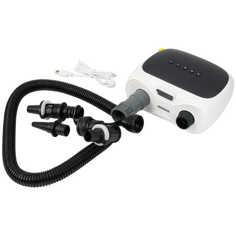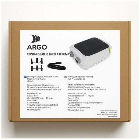 Η επαναφορτιζόμενη ηλεκτρική τρόμπα ARGO 10072 για SUP είναι η ιδανική λύση για γρήγορο και εύκολο φούσκωμα. Με μέγιστη πίεση 20psi, αυτή η τρόμπα διπλής ενέργειας διαθέτει ενσωματωμένη μπαταρία, επιτρέποντάς σας να φουσκώνετε οτιδήποτε με ακρίβεια. Η ψηφιακή ρύθμιση πίεσης με LCD οθόνη σας επιτρέπει να παρακολουθείτε την πίεση σε πραγματικό χρόνο, ενώ η αυτόματη απενεργοποίηση όταν φτάσει στην προεπιλεγμένη πίεση εξασφαλίζει ασφάλεια και ευκολία. Με ρυθμό ροής φουσκώματος 250 λίτρα/λεπτό και ξεφουσκώματος 70 λίτρα/λεπτό, η ARGO είναι γρήγορη και αποτελεσματική. Περιλαμβάνει έξι ακροφύσια για διαφορετικές ανάγκες και εύκαμπτο ενισχυμένο σωλήνα με βαλβίδα υψηλής πίεσης για αξιόπιστη χρήση. Είναι σημαντικό να μην την αφήνετε χωρίς επίβλεψη και να προσέχετε το σημείο τοποθέτησης κατά τη διάρκεια της λειτουργίας. Ιδανικά, τοποθετήστε την πάνω στο SUP κατά το φούσκωμα.