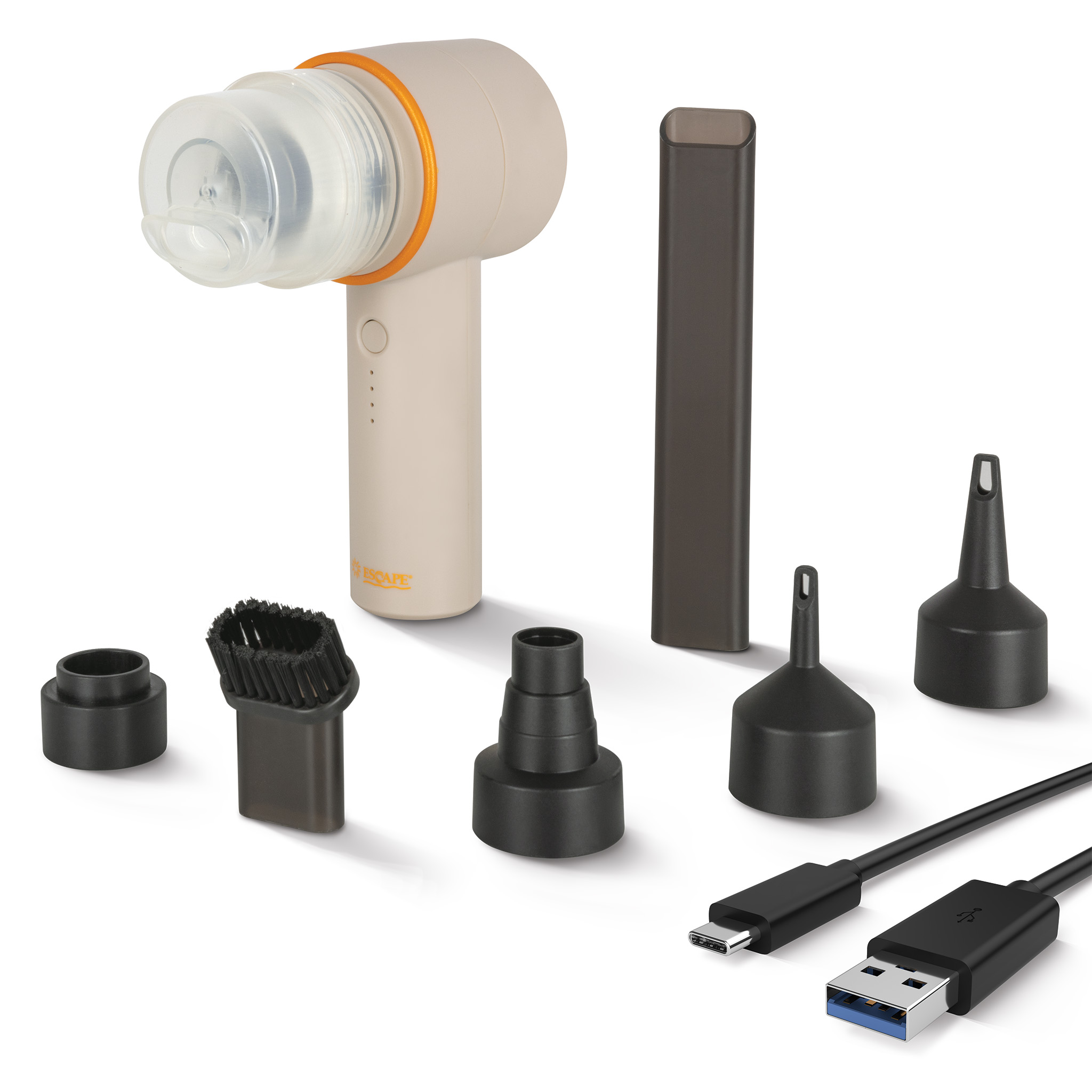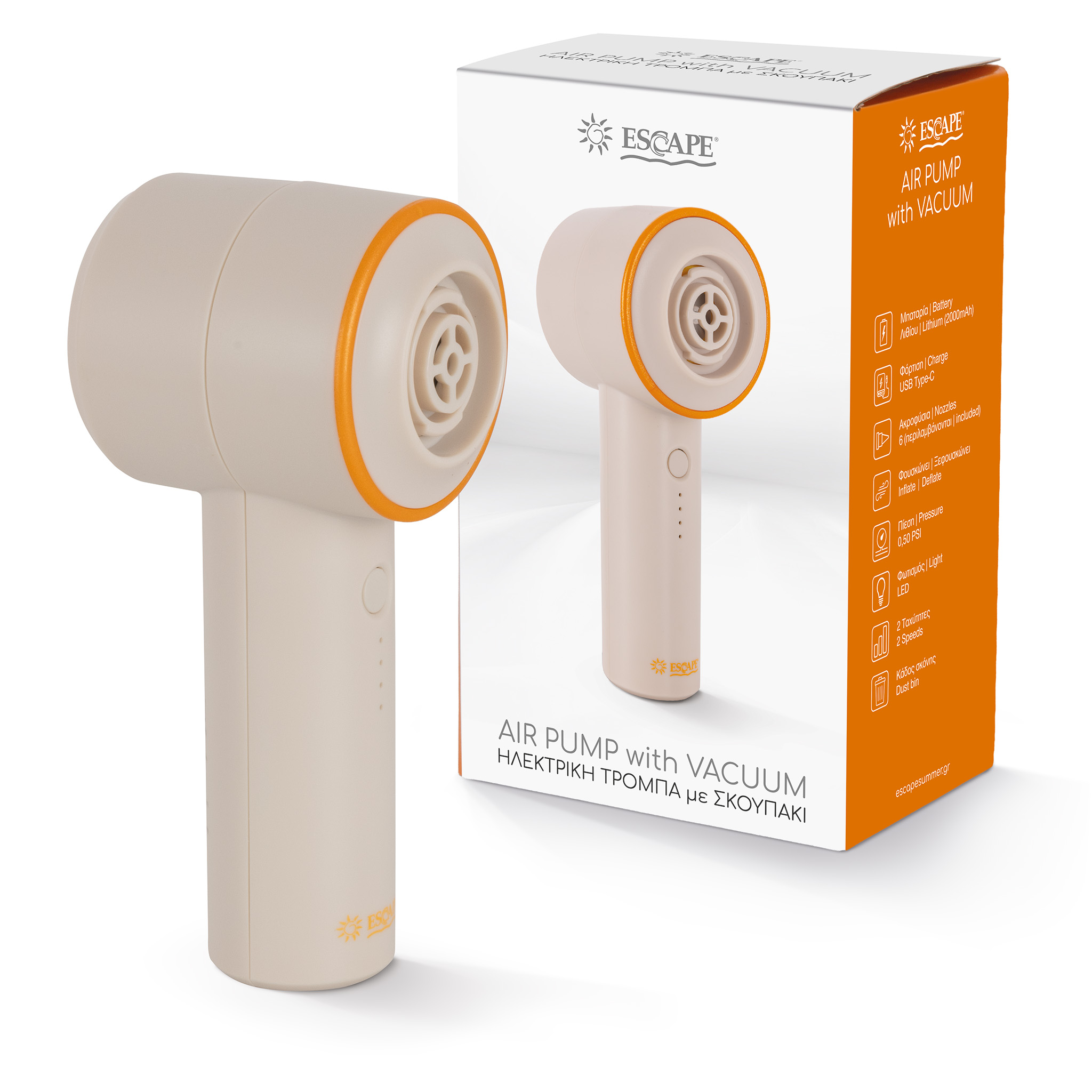 Η επαναφορτιζόμενη τρόμπα ESCAPE είναι το απόλυτο εργαλείο 4-σε-1: φουσκώνει και ξεφουσκώνει φουσκωτά σε δευτερόλεπτα, καθαρίζει σκόνη και ψίχουλα με πρακτικά ακροφύσια, λειτουργεί ως LED φωτιστικό και αφαιρεί αέρα από σακούλες αποθήκευσης κενού αέρος. Ελαφριά, ανθεκτική και ασύρματη, με μπαταρία λιθίου για χρήση παντού.