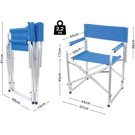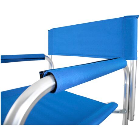 Καρέκλα σκηνοθέτη μπλε 15660 ιδανική για χρήση σε εξωτερικές δραστηριότητες, στην παραλία ή και στον χώρο σας. Κατασκευασμένη από σκελετό αλουμίνιου και ύφασμα Polyester 600D + PVC για μέγιστη αντοχή στον χρόνο. Απολαύστε άνετο και αναπαυτικό κάθισμα όπου και αν βρίσκεστε.