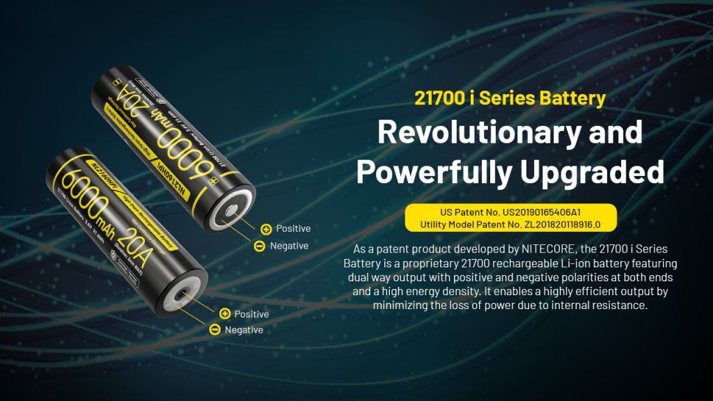 Ως πατενταρισμένο προϊόν που αναπτύχθηκε από την NITECORE, η μπαταρία της σειράς 21700i είναι μια αποκλειστική επαναφορτιζόμενη μπαταρία ιόντων λιθίου 21700 με διπλή έξοδο με θετική και αρνητική πολικότητα και στα δύο άκρα και υψηλή ενεργειακή πυκνότητα. Επιτρέπει μια εξαιρετικά αποδοτική έξοδο, ελαχιστοποιώντας την απώλεια ισχύος λόγω εσωτερικής αντίστασης.