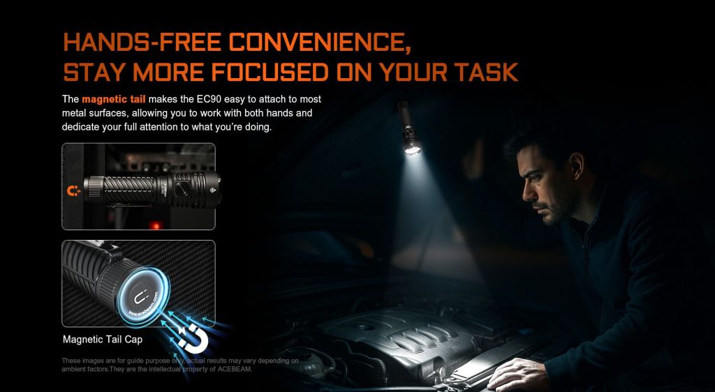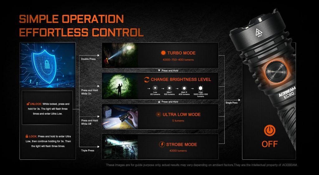 Το EC90 είναι ένας φακός EDC μεγάλης εμβέλειας, εξοπλισμένος με ένα ισχυρό LED SFT-90X. Παρέχει μια έντονη και εστιασμένη δέσμη με μέγιστη φωτεινότητα 4300 lumen και εντυπωσιακή εμβέλεια 573 μέτρων, εξασφαλίζοντας άριστη ορατότητα σε κάθε συνθήκη.