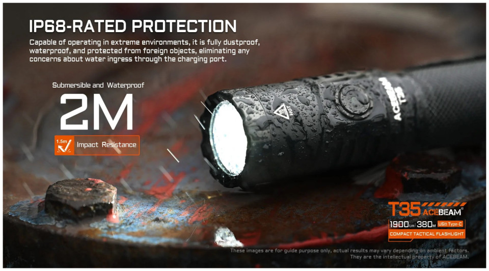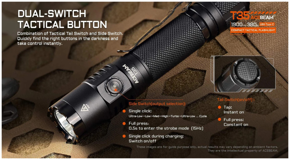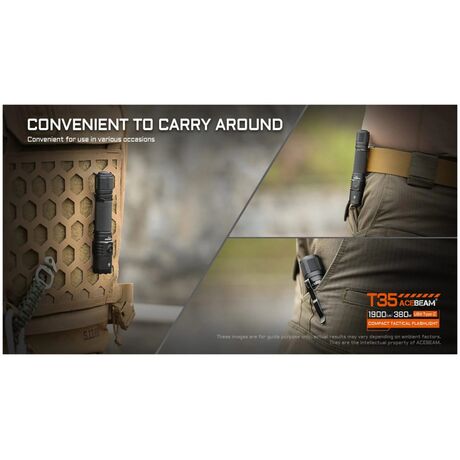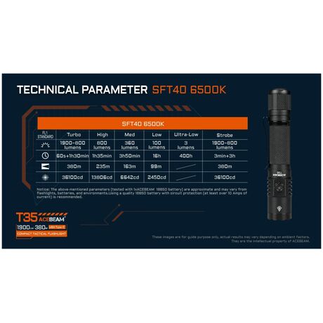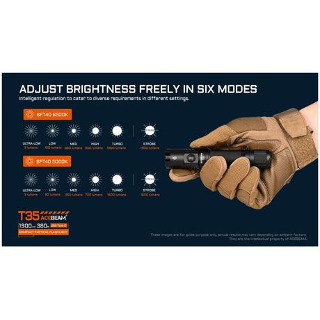 Χρησιμοποιήστε σε κάθε ανάγκη φωτισμού αυτό το κλασικό μοντέλο επιχειρησιακού φακού και κάντε εντύπωση. Ο συμπαγής tactical φακός T35 επιτρέπει την εύκολη εκτέλεση εργασιών σε περιβάλλον χαμηλού φωτισμού. Εξοπλισμένος με το LED SFT40, χρησιμοποιεί μια μπαταρία 18650 για μέγιστη απόδοση 1900 lumens. Όταν έχετε μαζί σας αυτόν τον υπέροχο φακό, αισθάνεστε πιο ασφαλείς και μπορείτε να περπατήσετε στα περισσότερα σκοτεινά μέρη με άνεση, καθώς εκτός από τον επαρκή φωτισμό που παρέχει, αυτός ο φακός είναι σχεδιασμένος για αυτοάμυνα αφού διαθέτει οδοντωτή στεφάνη για επίθεση. Διαθέτει ένδειξη μπαταρίας, πέντε επίπεδα φωτεινότητας και λειτουργία στροβοσκοπίου, έτσι ώστε να μπορεί να καλύψει διαφορετικές απαιτήσεις σε διαφορετικές συνθήκες.