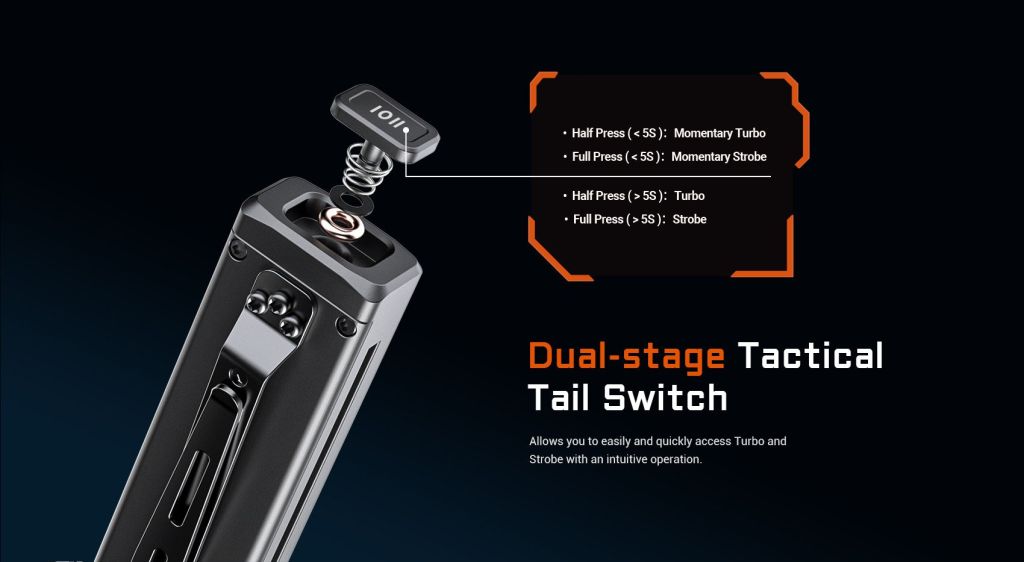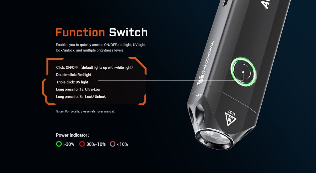 Ο ACEBEAM UC20 είναι ένας πολυλειτουργικός φακός EDC 3-σε-1, που συνδυάζει λευκό φως (1000 lumens), UV φως (365nm) και κόκκινο φως (23 lumens) για καθημερινό φωτισμό, έλεγχο σημείων και πολλά ακόμη. Ο διπλός διακόπτης στην στο πίσω μέρος προσφέρει άμεση πρόσβαση στη λειτουργία Turbo (1000 lumens) και στο strobe. Με γρήγορη φόρτιση USB-C, φορτίζει πλήρως σε μόλις 1,2 ώρες. Με αδιαβροχοποίηση 2 μέτρων και αντοχή σε πτώση από 1,5 μέτρο, είναι κατασκευασμένος για να αντέχει σε απαιτητικά περιβάλλοντα.