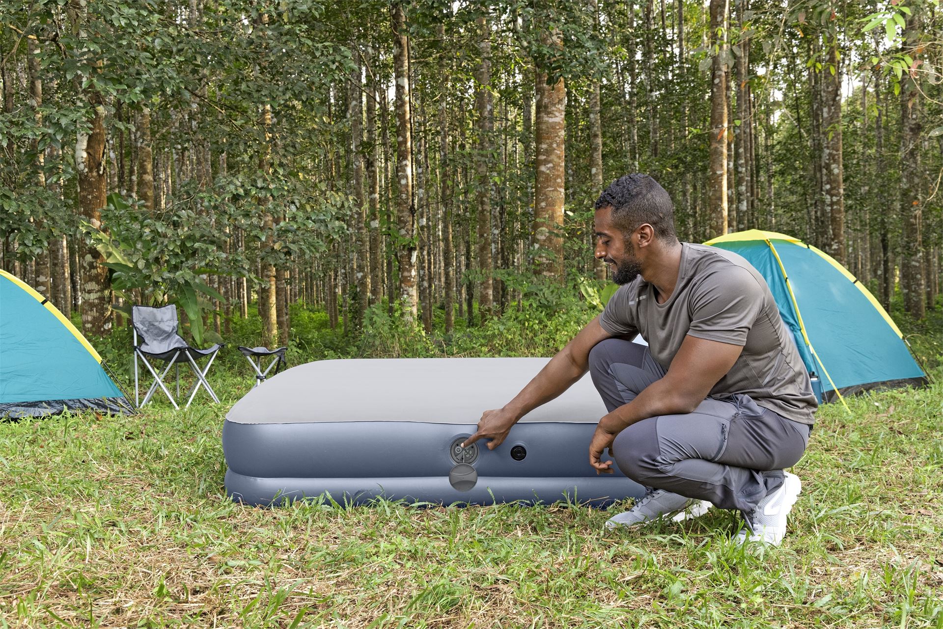 Διαθέτει φορητή ηλεκτρική αντλία με επαναφορτιζόμενη μπαταρία, η οποία φορτίζει μέσω USB και προσφέρει ασύρματη ευκολία και γρήγορο φούσκωμα (περίπου 240 δευτερόλεπτα). Με μία πλήρη φόρτιση μπορούν να πραγματοποιηθούν έως και δύο κύκλοι φουσκώματος, καθιστώντας το ιδανικό για εσωτερική και εξωτερική χρήση.