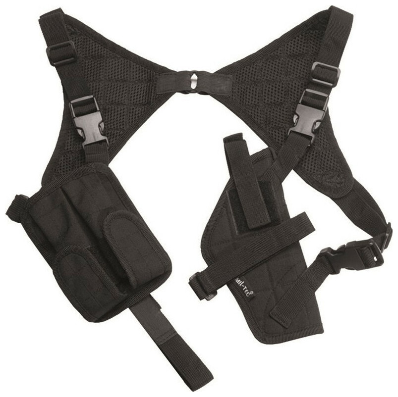 Θήκη όπλου με την υπογραφή της κορυφαίας εταιρείας Mil-Tec, κατάλληλη για ένστολους, κυνηγούς κλπ! Είναι κατασκευασμένη από 100% Nylon, ένα εξαιρετικά ανθεκτικό υλικό. Tο εσωτερικό του διαθέτει επένδυση από Nylon και είναι εξοπλισμένο με διπλή θήκη για γεμιστήρες. Οι θήκες εφαρμόζουν με πόρπες και μπορούν να χρησιμοποιηθούν είτε αριστερά, είτε δεξιά και διαθέτει ιμάντες που ασφαλίζουν στη ζώνη (ρυθμιζόμενοι μέσω velcro) και είναι κατασκευασμένοι με διαπνέον ύφασμα και ελαστικό τμήμα για άψογη εφαρμογή!