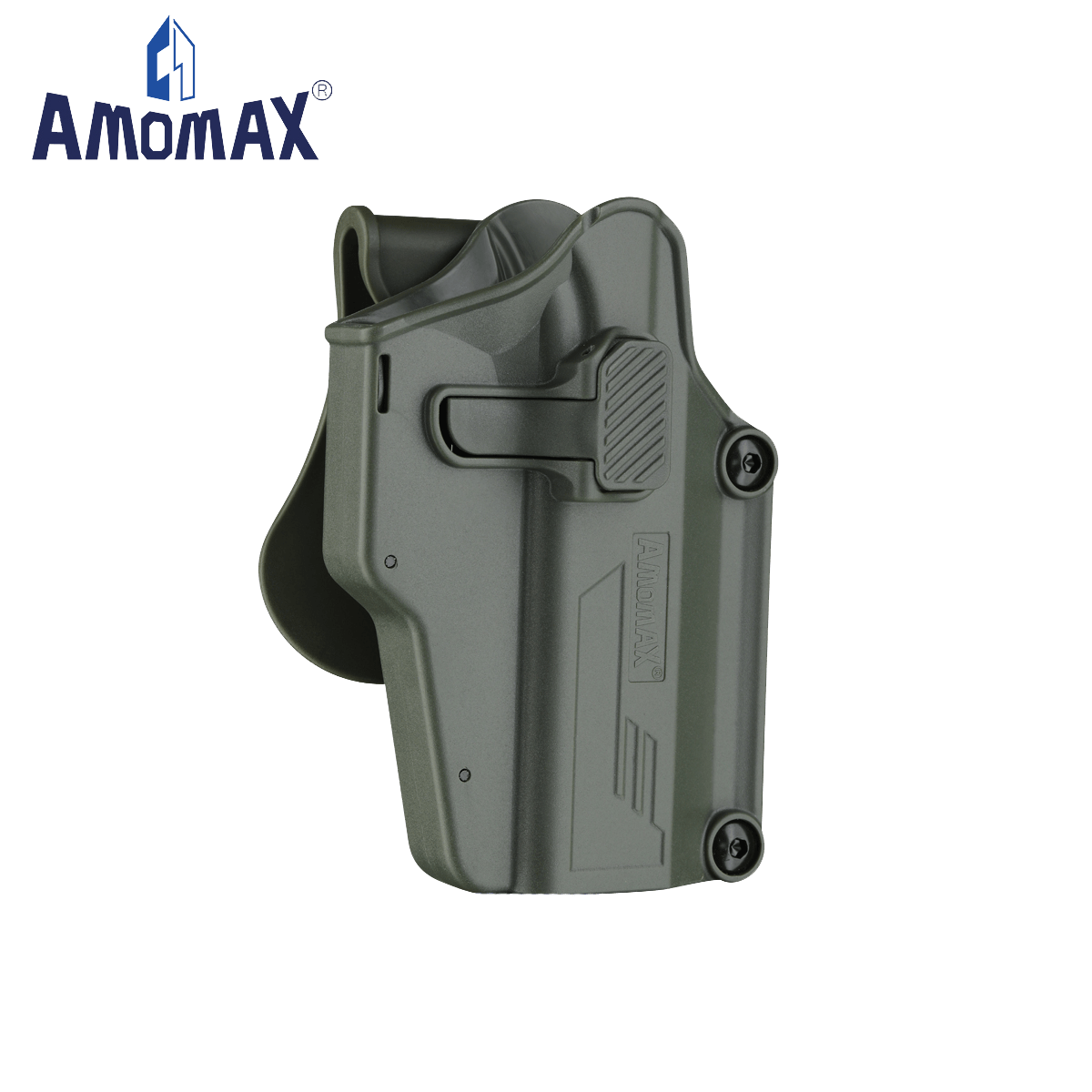 Θήκη Πιστολιού Amomax Per-Fit Universal συμβατή με περισσότερα από 80 airsoft ή πραγματικά πιστόλια, όπως Glock, Sig Sauer, CZ, Ruger, Springfield Armory, Beretta, Smith & Wesson, σειρά 1911 κ.λπ. Η κλασική απελευθέρωση με το δάχτυλο παρέχει ασφαλή συγκράτηση. Γραμμωτό φινίρισμα έχει προστεθεί στο κουμπί απελευθέρωσης, παρέχοντας πολύ καλή, επιχειρησιακή αίσθηση. Με 3 εύκολα βήματα ρυθμίζετε την θήκη ανάλογα με το μέγεθος του πιστολιού σας. Η θήκη Per-Fit είναι συμβατή με 4 διαφορετικές πλατφόρμες μεταφοράς – κουπί (στάνταρ), κλιπ ζώνης, MOLLE και πλατφόρμα μηρού. Το σώμα της θήκης περιστρέφεται 360 μοίρες. Οι χρήστες μπορούν εύκολα να προσαρμόσουν τη θέση μεταφοράς.