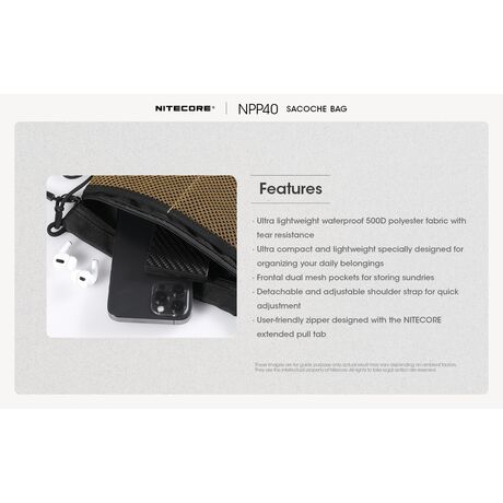 Τσαντάκι μεταφοράς Nitecore,με πολλαπλες θέσεις αποθήκευσης.Διαθέτει αδιάβροχη επένδυση πολυεστερικού υφάσματος 500D και εμπρόσθια διχτυωτή θήκη.Είναι ειδικά σχεδιασμένο για υπαίθριες δραστηριότητες και ταξίδια.Μπορεί να κρεμαστεί στον ώμο, στο πλάι εξωτερικά, αλλά και γύρω από την μέση από το ρυθμιζόμενο λουράκι.