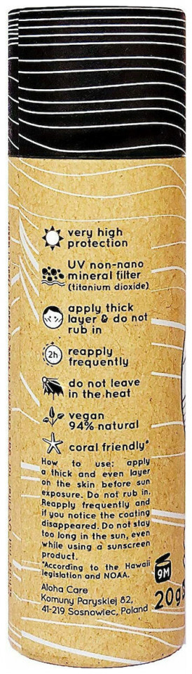 Το Aloha Sun Stick είναι ένα καταπληκτικό αντηλιακό σε μορφή stick απαραίτητο σε κάθε σέρφερ! Η πολύωρη παραμονή σας στο νερό είναι ιδιαίτερα επιβλαβής για το ευαίσθητο δέρμα του προσώπου, με αυτό το αντηλιακό όμως μπορείτε να κάνετε το αγαπημένο σας σπορ χωρίς τον φόβο του ηλιακού εγκαύματος καθώς παρέχει υψηλή προστασία από τον ήλιο με δείκτη SPF 50+ ενώ είναι σχεδιασμένο με φυσικά συστατικά. Με την αδιάβροχη σύνθεσή του παραμένει στη θέση του χωρίς να αφαιρείται από το νερό και το χρώμα του σας βοηθά να βλέπεται πότε χρειάζεται να κάνετε ανανέωση. Κατάλληλο για κάλυψη των τατουάζ ή σημαδιών στο δέρμα που δεν πρέπει να έρχονται σε επαφή με την ηλιακή ακτινοβολία.