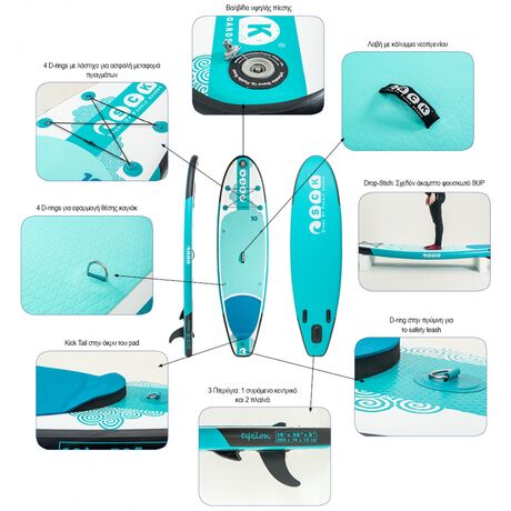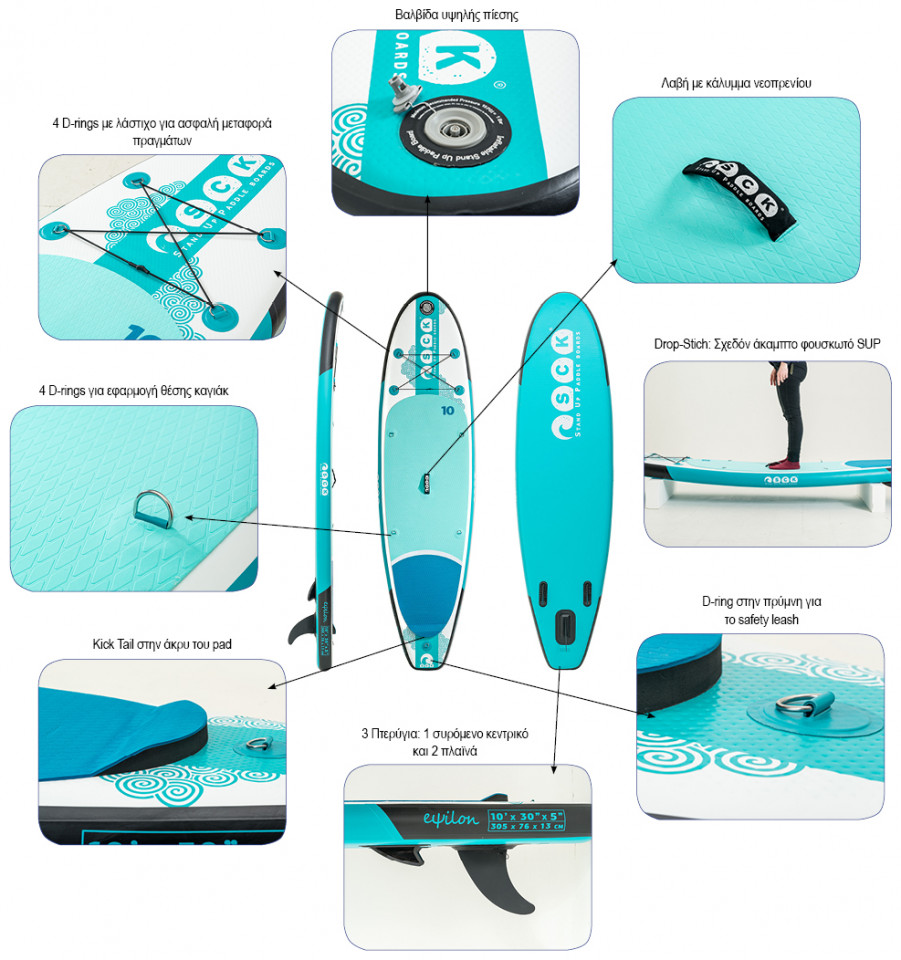 Μια πρακτική επιλογή από τη σειρά φουσκωτών Sup της SCK που εξασφαλίζουν άριστη ποιότητα και αντοχή. Η σανίδα όρθιας κωπηλασίας Epsilon 10' (2022) έχει διαστάσεις 310x76x15cm και είναι ανθεκτική σε φορτία έως 110 kg. Οι διαστάσεις του είναι κατάλληλες για γυναίκες, παιδιά και για αρχαρίους μετρίου αναστήματος και βάρους. Ιδανική επιλογή και για αυτούς που θέλουν ένα γρήγορο φουσκωτό SUP που να είναι εύκολο στους ελιγμούς. Το προϊόν διαθέτει συρόμενο πτερύγιο για να σας διασφαλίζει σταθερότητα και ευελιξία, ώστε να κωπηλατείτε με εξαιρετική άνεση. Ενσωματώνει πρακτικό σύστημα ιμάντων που σας επιτρέπει να αποθηκεύετε με ασφάλεια τον εξοπλισμό που χρειάζεστε στις αποδράσεις σας, αλλά και βολική χειρολαβή στο κέντρο της σανίδας που διασφαλίζει την εύκολη και άνετη μεταφορά της. Παράλληλα, η σανίδα διαθέτει 4 δαχτυλίδια σε περίπτωση που θέλετε να προσαρτήσετε κάθισμα και να τη χρησιμοποιήσετε ως καγιάκ, αλλά και δαχτυλίδι για την τοποθέτηση ιμάντα αστραγάλου που εξασφαλίζει την ασφάλειά σας κατά την πλεύση. Στο πακέτο συμπεριλαμβάνονται ρυθμιζόμενο κουπί αλουμινίου μήκους 165- 220 cm, τρόμπα με μανόμετρο για να ενημερώνεστε για την πίεση, ιμάντας αστραγάλου και κιτ επισκευής. Διατίθεται επίσης και πρακτική τσάντα πλάτης για να μπορείτε να μεταφέρετε με ευκολία και άνεση όλο τον απαραίτητο εξοπλισμό της αγαπημένης σας δραστηριότητας. Το προϊόν συνοδεύεται από εγγύηση 1 έτους. Πρόκειται για μια σανίδα με όμορφο σχεδιασμό και εξαιρετική πλευστότητα, εύκολη στην μεταφορά, πολύ ελαφριά και φουσκώνει σε λιγότερο από 10 λεπτά, αποτελεί σίγουρα ιδανική επιλογή για όσους θέλουν να ξεκινήσουν την όρθια κωπηλασία!
