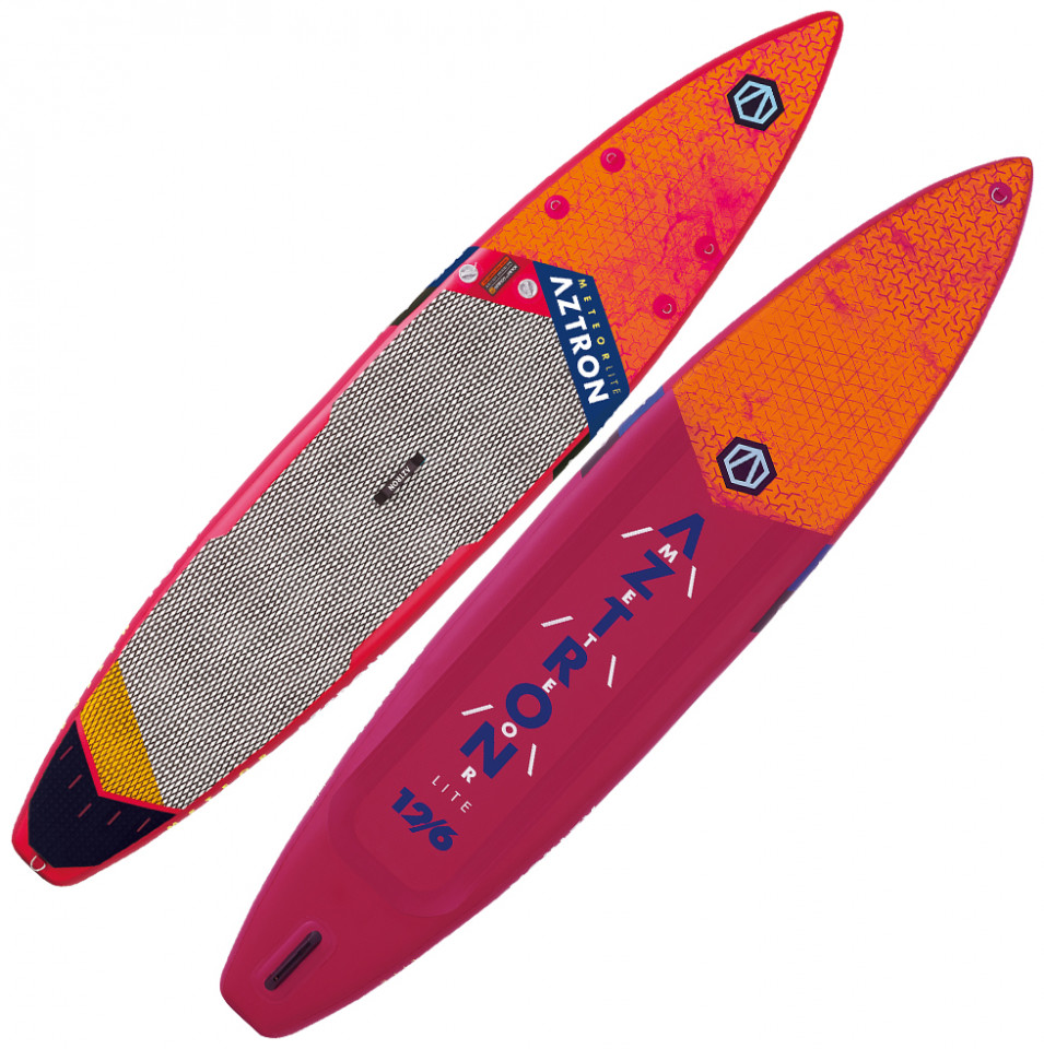 Φουσκωτή Σανίδα Sup Meteorlite Race 12'6'' της Aztron ιδανική επιλογή για αγωνιστική χρήση. Με μήκος 381, πλάτος 69 εκατοστά, ίσιο περίγραμμα, Kick Pad στην ουρά και στενή μύτη το Meteorlite διαθέτει τις ιδανικές αναλογίες για να πλεύσει με ταχύτητα και να αποκριθεί δυναμικά και άμεσα στις εντολές του αναβάτη του. Ο πυρήνας του κατασκευάζεται από πολύ υψηλής πυκνότητας drop stich υλικό ενώ τα ρέλια του είναι ενισχυμένα με πολλαπλές επιστρώσεις ώστε να αντέχουν στον πλάγιο κυματισμό, κάτι το σύνηθες στις Ελληνικές θάλασσες. Διαθέτει όπως όλα τα Sup της Aztron διπλό θάλαμο (Double Chamber) ώστε να είναι 30% πιο συμπαγές και άκαμπτο αλλά και να προσφέρει ασφάλεια πλεύσης υπό όλες τις συνθήκες. Ασφάλεια μεταφοράς αντικειμένων χάρις στο έξυπνο ρυθμιζόμενο σύστημα που διαθέτει, κουβαλήστε το σνακ σας το νερό σας και ότι άλλο χρειάζεστε κατά την διάρκεια τις πλεύσης σας. Η Συσκευασία περιλαμβάνει όλα τα απαραίτητα αξεσουάρ για να απολαμβάνεται με άνεση το αγαπημένο σας χόμπι. Αναλυτικότερα η συσκευασία περιλαμβάνει 1 τρόμπα χειρός διπλής ενέργειας, δέστρα αστραγάλου, πτερύγιο, κιτ επισκευής για την επιδιόρθωση πιθανόν μελλοντικών φθορών, και τσάντα μεταφοράς για να μεταφέρετε και να αποθηκεύετε με ασφάλεια και άνεση όλο τον απαραίτητο εξοπλισμό σας.