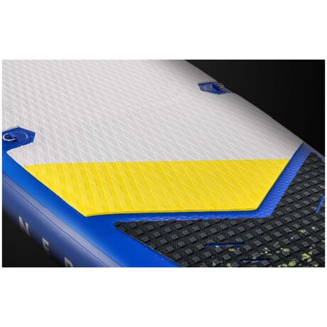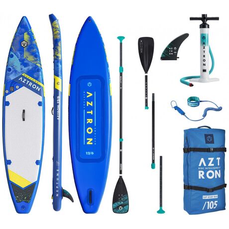 Φουσκωτή Σανίδα Sup Neptune 12'6'' Aztron είναι ιδανικό για χρήστες που θέλουν να καλύψουν με γρήγορο ρυθμό μεγάλες αποστάσεις. Εχει κορυφαίο υδροδυναμικό σχεδιασμό, ξεκινώντας από το κωνικού σχήματος εμπρόσθιο τμήμα, συνεχίζοντας με ένα κυρίως σώμα αρμονικών γραμμών που σχηματίζουν ένα προοδευτικό rocker profile και καταλήγοντας σε μία μελετημένη τραπεζοειδή ουρά με ανεβασμένο τελείωμα (kick Tail) που επιτρέπει σε αυτό το μεγάλο iSUP να στρέφει αποτελεσματικά, να αντιδρά γρήγορα και να συγχωρεί λάθη! Ο πυρήνας του κατασκευάζεται από πολύ υψηλής πυκνότητας drop stich υλικό ενώ τα ρέλια του είναι ενισχυμένα με πολλαπλές επιστρώσεις ώστε να αντέχουν στον πλάγιο κυματισμό, κάτι το σύνηθες στις Ελληνικές θάλασσες. Ασφαλή μεταφορά φορτίων χάρις στο είδικά τοποθετημένο σύστημα στο μπροστινό μέρος! Ενσωματωμένη χειρολαβή για εύκολη και άνετη μεταφορά. Όλες οι λαβές της Aztron φτιάχνονται από υψηλής ποιότητας νεοπρένιο και ενισχύονται με λαστιχένιο μαξιλαράκι ώστε να έχουν αντοχή και σίγουρο κράτημα. Αντιολισθητική επίστρωση EVA στο κατάστρωμα με 4mm αυλάκωση σε διαμαντένιο σχέδιο, προσφέρει την απόλυτη σταθερότητα στο πέλμα. Όπως όλα τα Touring iSUP της Aztron, το Neptune έχει προικιστεί με τις καινοτόμες τεχνολογίες Double Champer και Double Layer Fusion (διπλός θάλαμος – διπλή επίστρωση υλικού με Fusion) που αυξάνουν εκθετικά την ακαμψία και την ασφάλεια των iSUP, μειώνοντας ταυτόχρονα το βάρος τους. Το ψηλό Rocker της πλώρης συνδυάζεται με το Kick Pad της πρύμνης για να αυξήσει την σταθερότητα και την ικανότητα στην κυματώδη θάλασσα, ενώ βελτιώνει και την ικανότητα στροφής. Το αποτέλεσμα είναι ένα iSUP που προσεγγίζει την στιβαρότητα και την ασφάλεια μιας σταθερής σανίδας ενώ είναι ελαφρύτερο από τα υπόλοιπα iSUP κερδίζοντας σε ταχύτητα και ευχρηστία. Ταυτόχρονα είναι ένα από τα ελάχιστα Touring iSUP που διατηρεί την σταθερότητα και κατευθυντικότητα του ακόμα και σε άστατα νερά.