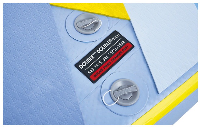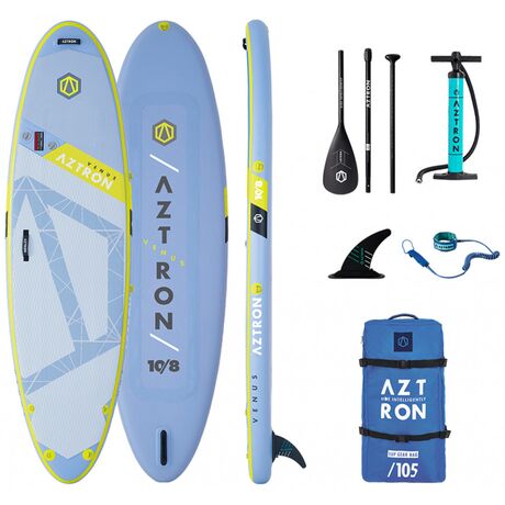 Φουσκωτή Σανίδα Sup Venus 10'8'' της Aztron σχεδιάστηκε για να μπορεί να λειτουργεί και ως θαλάσσια πλατφόρμα εξάσκησης Fitness και Yoga! Χάρις στις άνετες διαστάσεις (325 εκ. μήκος, 86 εκ. πλάτος) και το παχύ προφίλ του, είναι πολύ σταθερό ώστε οι διάφορες ασκήσεις και στάσεις να εκτελούνται με άνεση. Έχει ληφθεί μέριμνα για την αποφυγή γλιστρήματος του αναβάτη αφού σχεδόν όλη η επιφάνεια του καταστρώματος είναι ανάγλυφη και καλυμμένη με απαλό EVA αντιολισθητικό υλικό. Η ιδιαίτερα εκλεπτυσμένη σχεδίαση και τα απαλά του χρώματα προδιαθέτουν θετικά και δημιουργούν μία ωραία εικόνα άνεσης και χαλάρωσης! Σε μία σχετικά ήρεμη θάλασσα η εμπειρία της άσκησης πάνω σε ένα Venus είναι πραγματικά ξεχωριστή. Ταυτόχρονα η αυξημένη μυϊκή συνεργία που απαιτεί η ισορροπία στο νερό βοηθά στην εκτέλεση σύνθετων προγραμμάτων άσκησης και συγκέντρωσης. Ασφαλή μεταφορά φορτίων χάρις στο ειδικά τοποθετημένο σύστημα στο μπροστινό μέρος! Ενσωματωμένη χειρολαβή για εύκολη και άνετη μεταφορά. Όλες οι λαβές της Aztron φτιάχνονται από υψηλής ποιότητας νεοπρένιο και ενισχύονται με λαστιχένιο μαξιλαράκι ώστε να έχουν αντοχή και σίγουρο κράτημα. Αντιολισθητική επίστρωση EVA στο κατάστρωμα με 4mm αυλάκωση σε διαμαντένιο σχέδιο, προσφέρει την απόλυτη σταθερότητα στο πέλμα. Παρότι το Venus είναι fitness focused , είναι ταυτόχρονα και ένα πολύ καλό iSUP για κωπηλασία!. Το αρμονικό All Around σχήμα του και οι κορυφαίες Double – Double τεχνολογίες της Aztron ( διπλός θάλαμος και διπλή επίστρωση Fusion), δίνουν ένα πολύ στιβαρό και ελαφρύ SUP με μεγάλες ικανότητες σε όλα τα νερά, που δεν έχει να ζηλέψει σε τίποτα από τα υπόλοιπα SUP της εταιρείας. Πρόκειται τέλος για ένα πανέμορφο iSUP με άψογη ποιότητα κατασκευής και ιδιαίτερη προσοχή στη λεπτομέρεια.