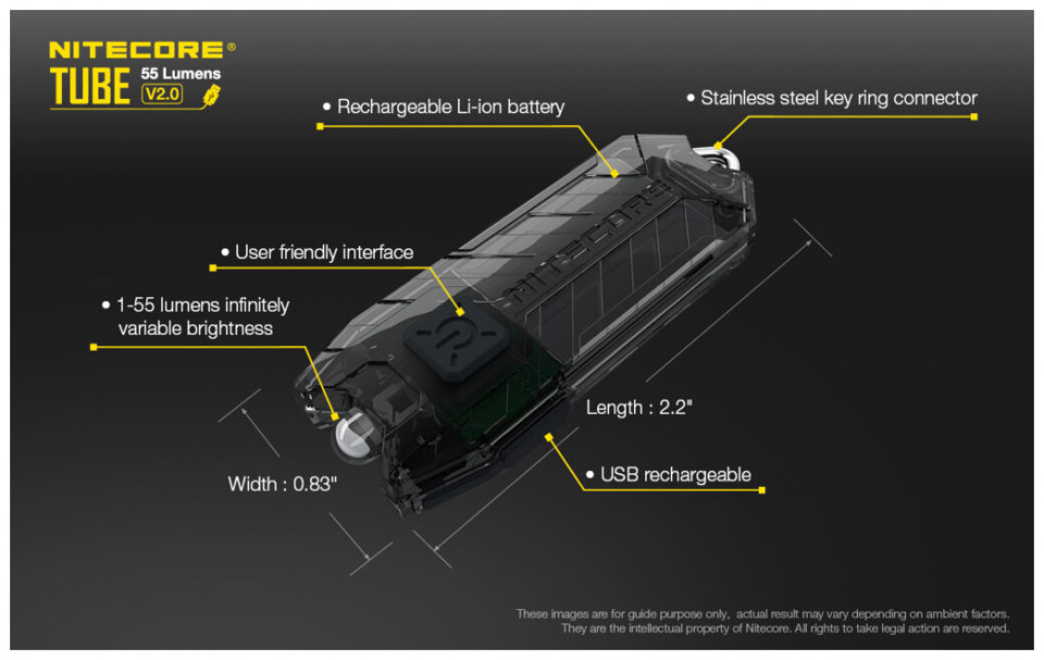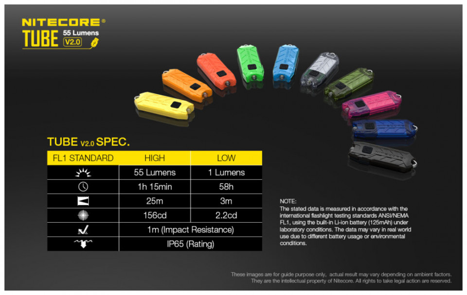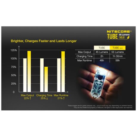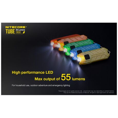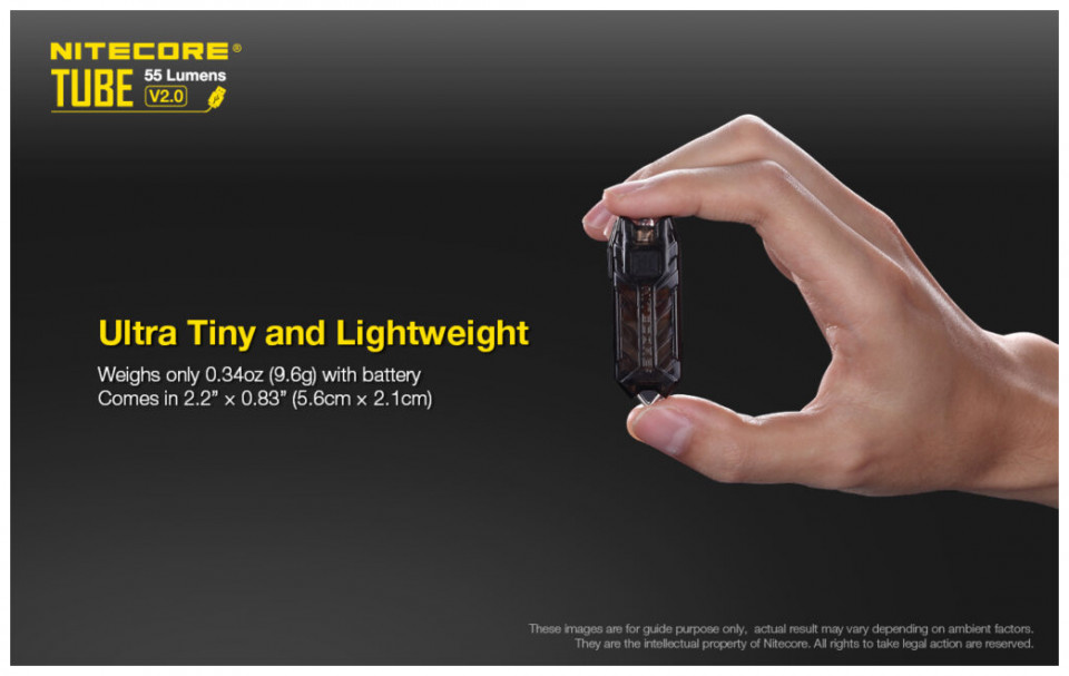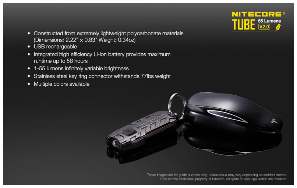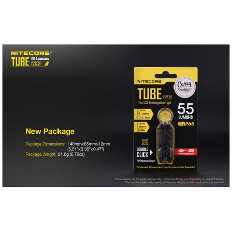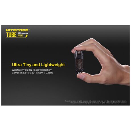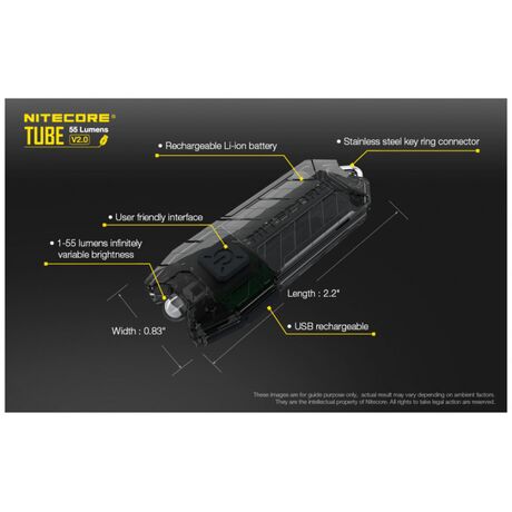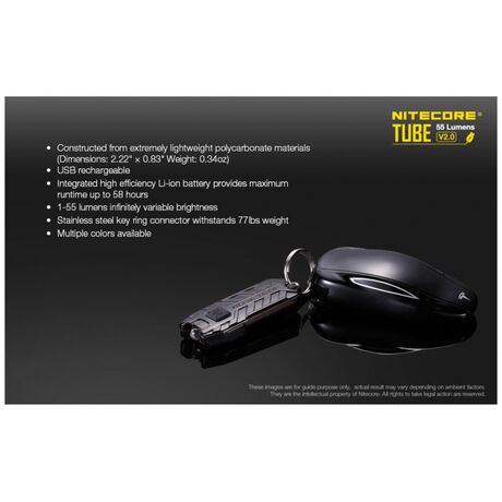 Ο εξαιρετικά ελαφρύς και ανθεκτικός φακός- μπρελόκ Led Nitecore Tube διαθέτει μέγιστη απόδοση έως και 55 Lumens, ενώ η απόσταση εκπομπής της δέσμης του μπορεί να καλύψει μέχρι και 25 μέτρα. Η εξαιρετικά ευρεία δέσμη εκπομπής 100° προσφέρει άψογη περιφερειακή όραση.  Έχει τη δυνατότητα επιλογής μεταξύ δύο επιπέδων φωτεινότητας προσβάσιμα μέσω ενός διακόπτη για εύκολη χρήση με το ένα μόνο χέρι! Λειτουργεί με ενσωματωμένη επαναφορτιζόμενη μπαταρία Li-ion υψηλής απόδοσης, η οποία μπορεί να προσφέρει λειτουργία έως και 58 ώρες στην χαμηλή λειτουργία. Η φόρτισή του μπορεί να γίνει με ένα  Το προϊόν είναι αδιάβροχο σύμφωνα με την πιστοποίηση IP65. Χάρη στον στιβαρό σχεδιασμό του αντέχει πτώσεις από έως και 1.5 μέτρα ύψος, ενώ το διπλό μεταλλικό δαχτυλίδι, από το οποίο συνοδεύεται, μπορεί να αντέξει μέχρι και 35 κιλά.