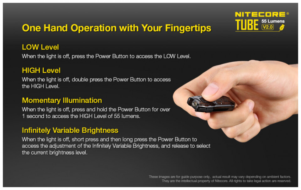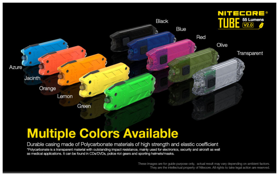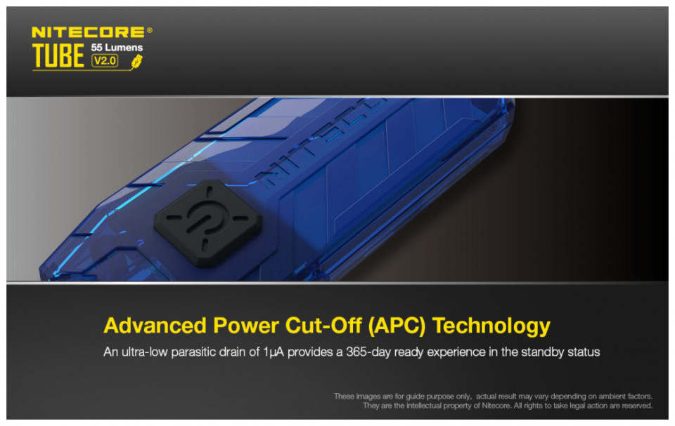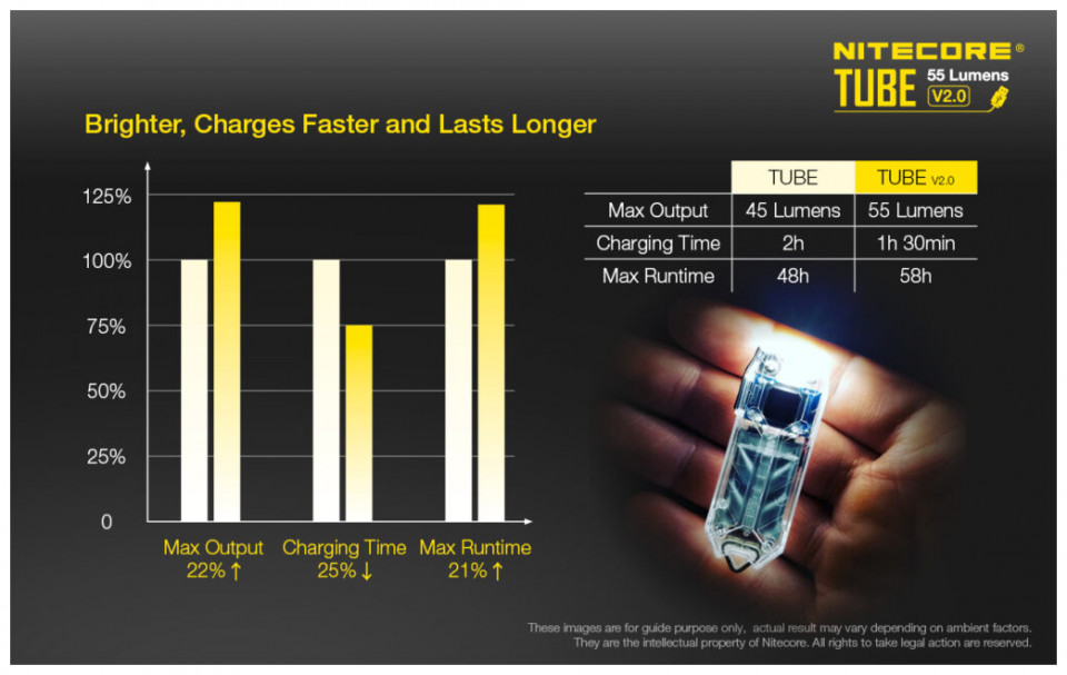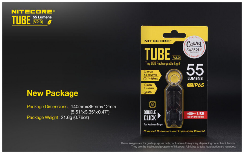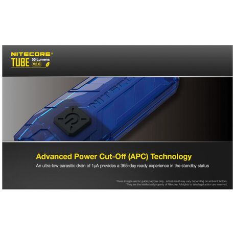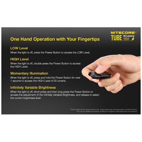 Ο εξαιρετικά ελαφρύς και ανθεκτικός φακός- μπρελόκ Led Nitecore Tube διαθέτει μέγιστη απόδοση έως και 55 Lumens, ενώ η απόσταση εκπομπής της δέσμης του μπορεί να καλύψει μέχρι και 25 μέτρα. Η εξαιρετικά ευρεία δέσμη εκπομπής 100° προσφέρει άψογη περιφερειακή όραση.  Έχει τη δυνατότητα επιλογής μεταξύ δύο επιπέδων φωτεινότητας προσβάσιμα μέσω ενός διακόπτη για εύκολη χρήση με το ένα μόνο χέρι! Λειτουργεί με ενσωματωμένη επαναφορτιζόμενη μπαταρία Li-ion υψηλής απόδοσης, η οποία μπορεί να προσφέρει λειτουργία έως και 58 ώρες στην χαμηλή λειτουργία. Η φόρτισή του μπορεί να γίνει με ένα  Το προϊόν είναι αδιάβροχο σύμφωνα με την πιστοποίηση IP65. Χάρη στον στιβαρό σχεδιασμό του αντέχει πτώσεις από έως και 1.5 μέτρα ύψος, ενώ το διπλό μεταλλικό δαχτυλίδι, από το οποίο συνοδεύεται, μπορεί να αντέξει μέχρι και 35 κιλά.