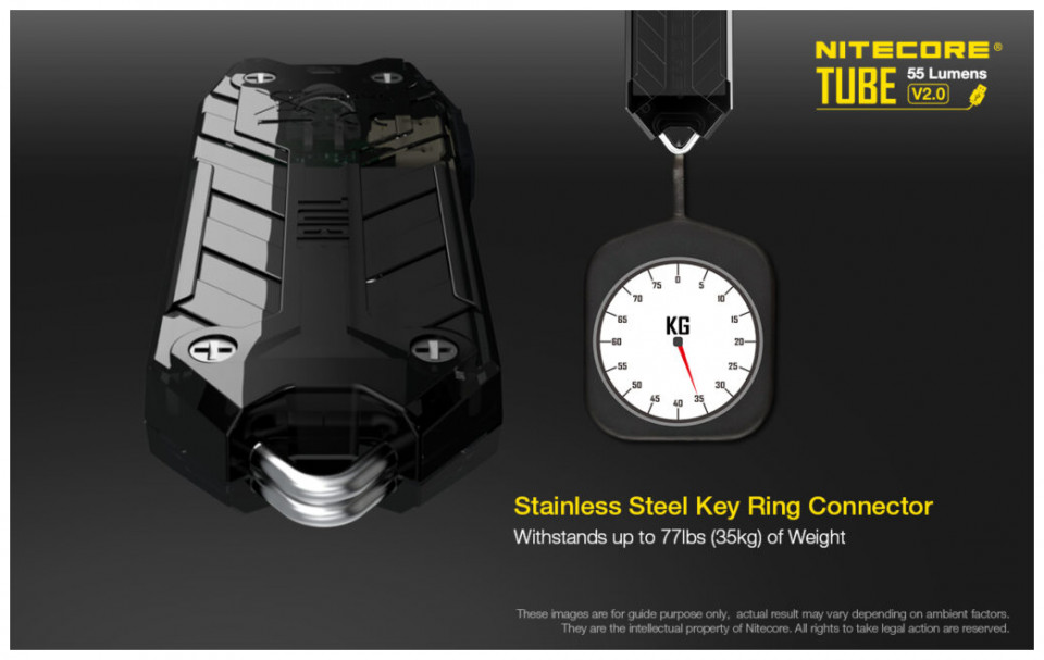 Ο εξαιρετικά ελαφρύς και ανθεκτικός φακός- μπρελόκ Led Nitecore Tube διαθέτει μέγιστη απόδοση έως και 55 Lumens, ενώ η απόσταση εκπομπής της δέσμης του μπορεί να καλύψει μέχρι και 25 μέτρα. Η εξαιρετικά ευρεία δέσμη εκπομπής 100° προσφέρει άψογη περιφερειακή όραση.  Έχει τη δυνατότητα επιλογής μεταξύ δύο επιπέδων φωτεινότητας προσβάσιμα μέσω ενός διακόπτη για εύκολη χρήση με το ένα μόνο χέρι! Λειτουργεί με ενσωματωμένη επαναφορτιζόμενη μπαταρία Li-ion υψηλής απόδοσης, η οποία μπορεί να προσφέρει λειτουργία έως και 58 ώρες στην χαμηλή λειτουργία. Η φόρτισή του μπορεί να γίνει με ένα  Το προϊόν είναι αδιάβροχο σύμφωνα με την πιστοποίηση IP65. Χάρη στον στιβαρό σχεδιασμό του αντέχει πτώσεις από έως και 1.5 μέτρα ύψος, ενώ το διπλό μεταλλικό δαχτυλίδι, από το οποίο συνοδεύεται, μπορεί να αντέξει μέχρι και 35 κιλά.