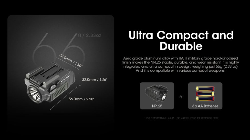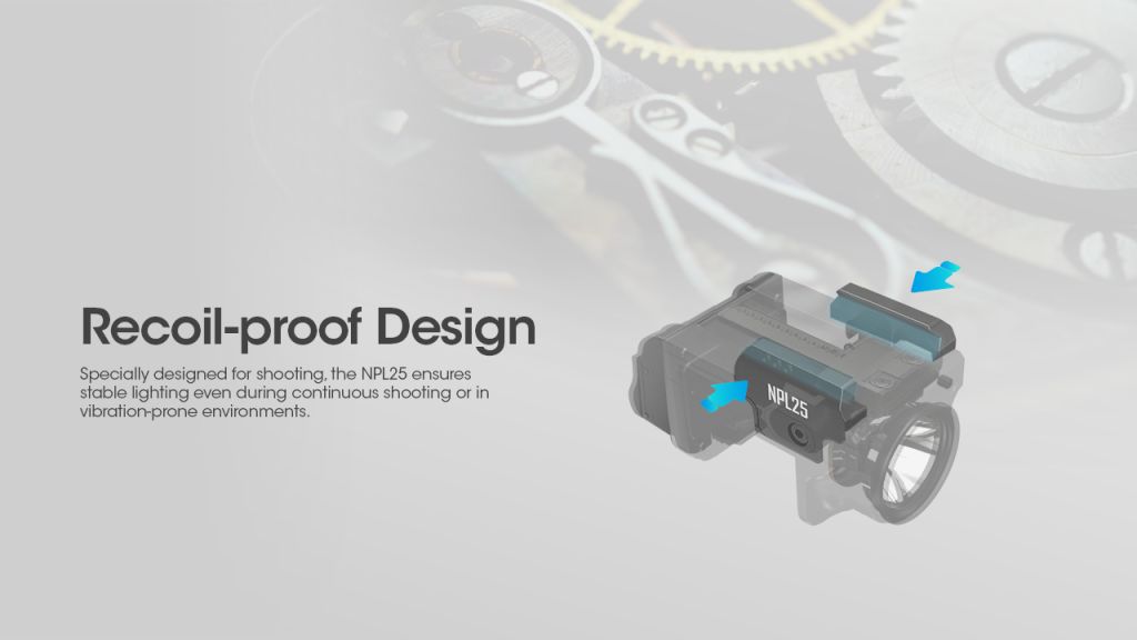 Ειδικά σχεδιασμένος για σκοποβολή, ο φακός  NITECORE NPL25 εξασφαλίζει σταθερό φωτισμό ακόμα και κατά τη διάρκεια συνεχών πυροβολισμών ή σε περιβάλλοντα που είναι επιρρεπή σε κραδασμούς.