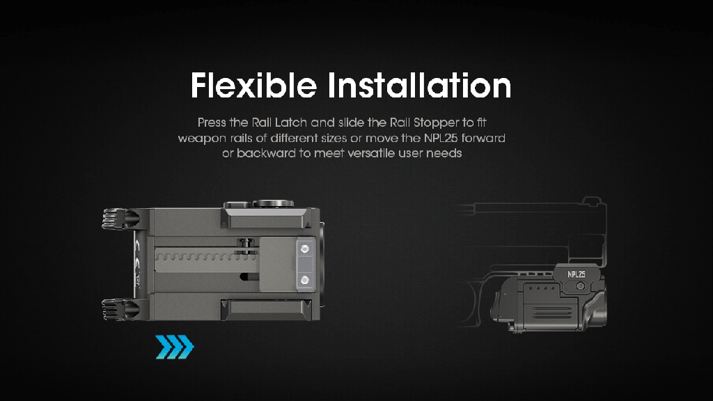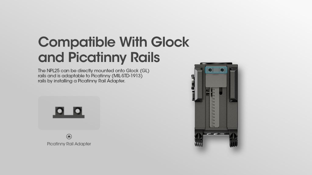 Ο φακός NITECORE NPL25 μπορεί να τοποθετηθεί άμεσα στην ράγα από  ένα πιστόλι Glock και μπορεί να προσαρμοστεί και σε ράγα Picatinny (MIL-STD-1913) τοποθετώντας έναν αντάπτορα για τις ράγες αυτές.
