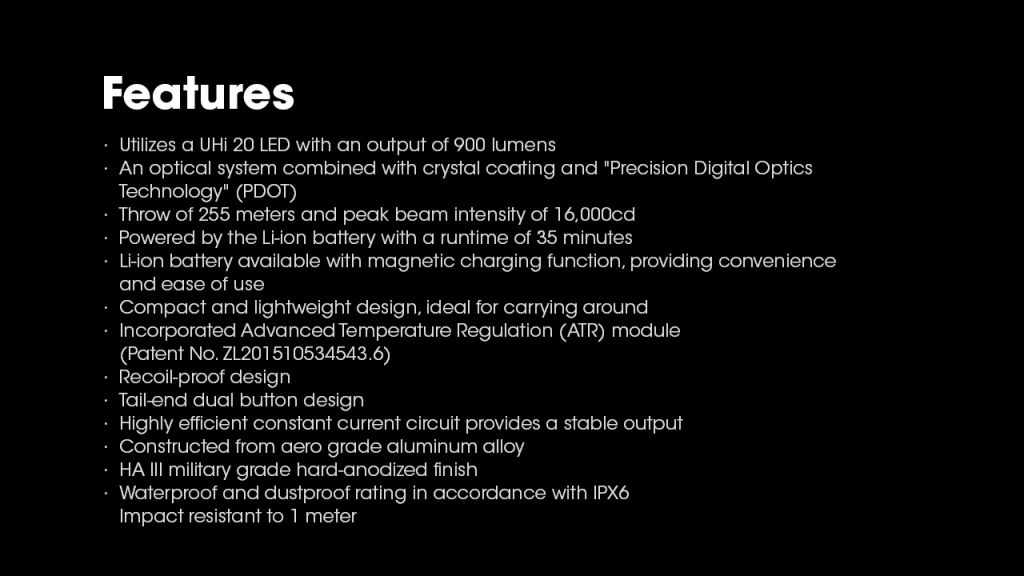 Σημείωση: Τα αναφερόμενα δεδομένα έχουν μετρηθεί σύμφωνα με τα διεθνή πρότυπα δοκιμών  των φακών ANSI/PLATO FL 1-2019 χρησιμοποιώντας μια μπαταρία ιόντων λιθίου (500mAh) υπό εργαστηριακές συνθήκες. Τα δεδομένα ενδέχεται να διαφέρουν σε πραγματική χρήση λόγω διαφορετικών περιβαλλοντικών συνθηκών