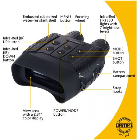 Η τροφοδοσία της συσκευής με ενέργεια γίνεται με 3 ΑΑ κοινές μπαταρίες οι οποίες μπορούν να καλύψουν έως 10 ώρες συνεχόμενης χρήσης σε απλή λειτουργία χωρίς τον υπέρυθρο φωτισμό. Κατασκευασμένο με εργονομικό σχεδιασμό για να σας προσφέρει άνετο κράτημα και εύκολο χειρισμό ενώ με το σπείρωμα ¼" έχετε την δυνατότητα να την προσαρτήσετε σε τρίποδα για πιο άνετη παρατήρηση επίσης διαθέτει αδιάβροχο περίβλημα για προστασία των ηλεκτρονικών και των οπτικών στοιχείων.