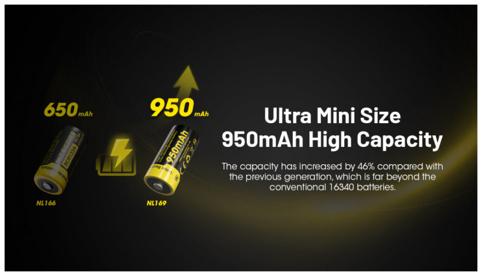 Υψηλής απόδοσης επαναφορτιζόμενη μπαταρία NL169 της Nitecore με τεχνολογία ιόντων λιθίου Li-ion. Με σεβασμό στο περιβάλλον καθώς είναι απαλλαγμένη από μόλυβδο, υδράργυρο και κάδμιο ενώ η διάρκεια ζωής και οι 500 κύκλοι φόρτισης ισοδυναμούν με 16340 συμβατικές μπαταρίες! Ο καινοτόμος σχεδιασμός του ανοδίου με επινικελωμένο ανοξείδωτο ατσάλι την καθιστά ανθεκτική στην αύξηση της θερμοκρασίας ενώ διαθέτει βαλβίδα εκτόνωσης πίεσης σε περίπτωση ταχείας αύξησης της. Διαθέτει υψηλής απόδοσης ενσωματωμένο έξυπνο κύκλωμα προστασίας από υπερφόρτιση, υπερβολική αποφόρτιση και βραχυκυκλώματος. Εξασφαλισμένη ηλεκτρική αγωγιμότητα, αντοχή στην οξείδωση και αντοχή στην υγρασία, τiς πτώσεις και την τριβή. Μια αξιόπιστη και ασφαλής επιλογή με πολλές πιστοποιήσεις παγκοσμίως.