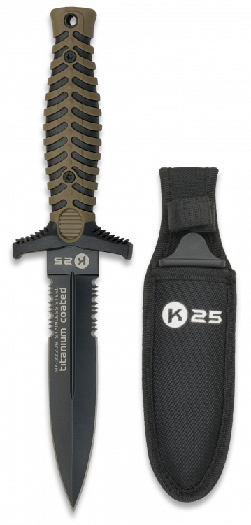 Μαχαίρι από την Κ25 με κωδικό 32206,έχει μήκος λάμας 12,5 εκατοστά με πάχος 4 χιλιοστά.Το υλικό κατασκευής της λάμας είναι ανοξείδωτο ατσάλι με επίστρωση τιτανίου για μεγαλύτερη αντοχή και ποιότητα.Έχει μικρό μέγεθος για να μπορείτε να το κουβαλάτε παντού μαζί σας και είναι ελαφρύ σε βάρος.Ιδανικό αξεσουάρ για να σας συντροφεύει στις υπαίθριες δραστηριότητες σας και όχι μόνο αφού μπορείτε να το έχετε παντού μαζί σας!
