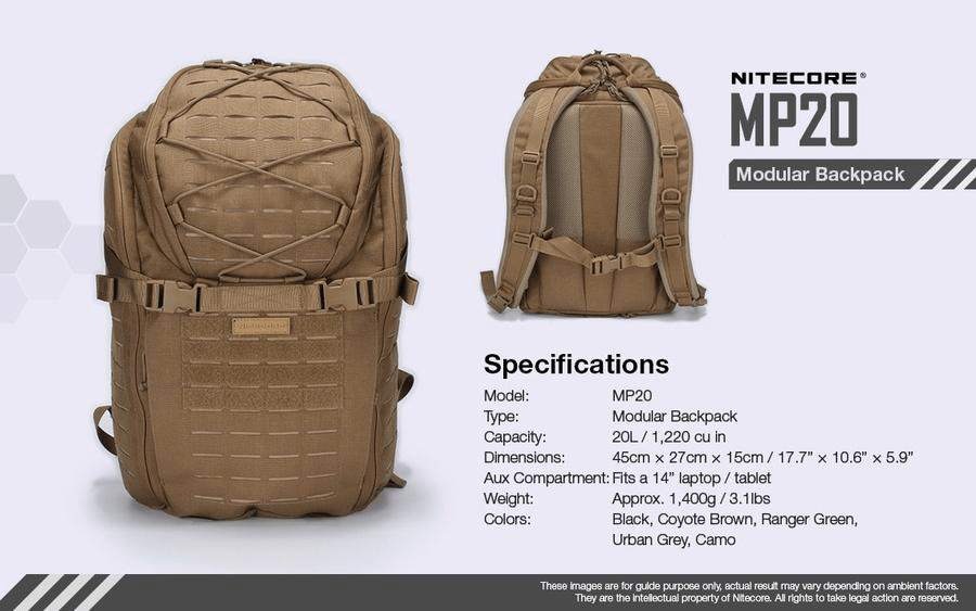 Σακίδιο πλάτης Nitecore χωρητικότητας 20 λίτρων με εσωτερικό σχεδιασμό που συνδυάζει επιφάνειες με βρόγχους και επιφάνειες με σύστημα ανάρτησης MOLLE.Είναι σχεδιασμένη για επιχειρήσεις μεγάλων αποστάσεων και μεγάλης διάρκειας,κατασκευασμένη από συνθετικό ύφασμα Nylon 500D ανθεκτικό στις τριβές και με αντίσταση στο νερό.Διαθέτει καινοτόμο σχεδιασμό για τη στήριξη από το καλάμι του υδροδοχείου και στις δύο πλευρές του σακιδίου.